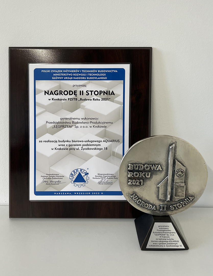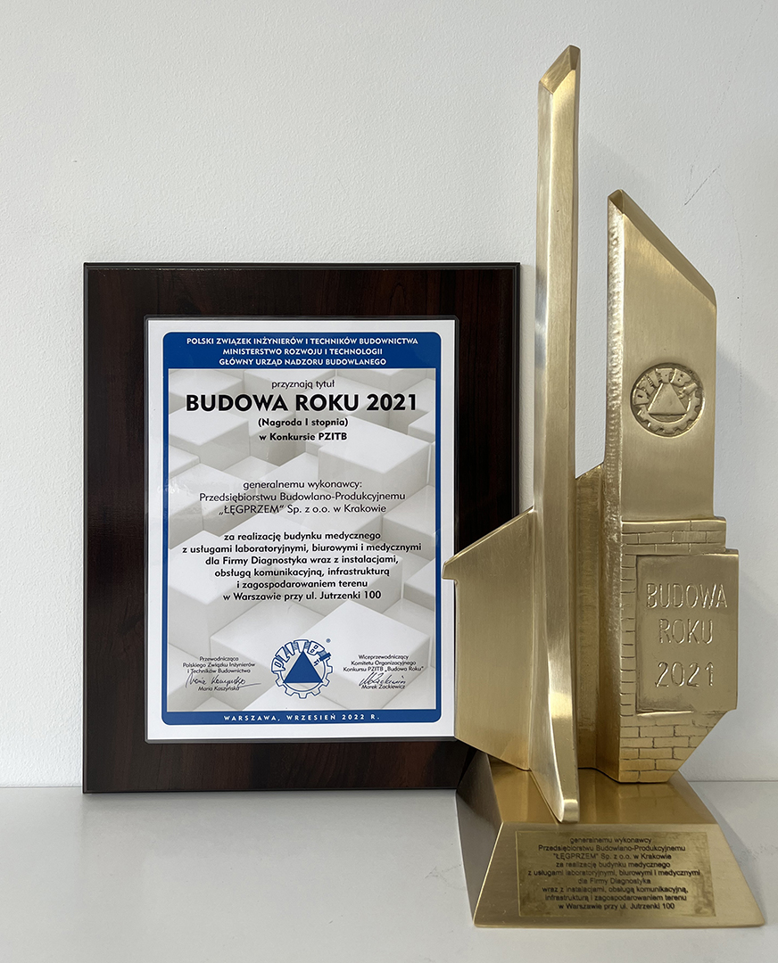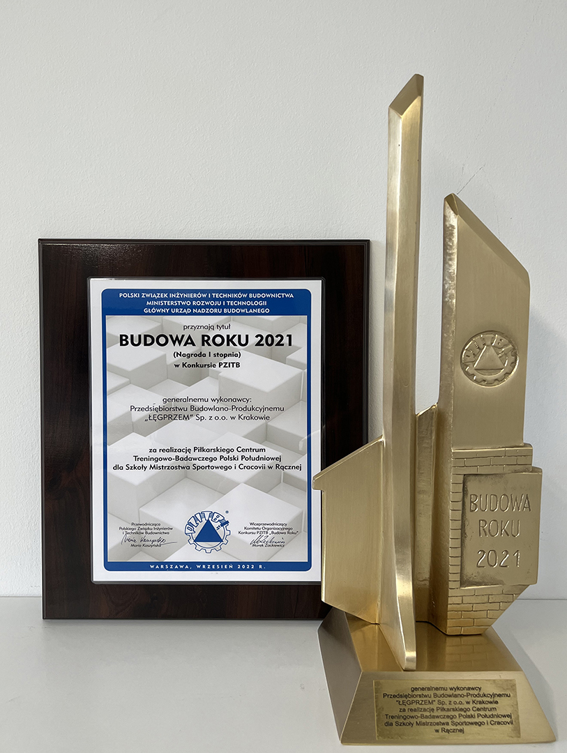 Z przyjemnością informujemy, że nasza firma została laureatem konkursu „Budowa Roku 2021” i otrzymała trzy nagrody, w tym dwie nagrody I stopnia. Obiekty, które uzyskały tytuł Budowy Roku to: Piłkarskie Centrum Treningowo-Badawcze Polski Południowej dla Szkoły Mistrzostwa Sportowego i Cracovii w Rącznej (nagroda I stopnia), Budynek medyczny z usługami laboratoryjnymi, biurowymi i medycznymi dla Firmy Diagnostyka przy ul. Jutrzenki 100 w Warszawie (nagroda I stopnia) oraz Budynek biurowo-usługowy AQUARIUS przy ul. Życzkowskiego 18 w Krakowie (nagroda II stopnia).