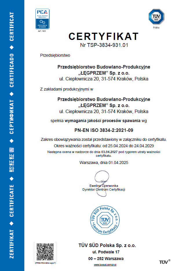 – Certyfikat Nr TSP-3834-931.01 potwierdzający spełnianie wymagań jakości procesów spawania według normy PN-EN ISO 3834.